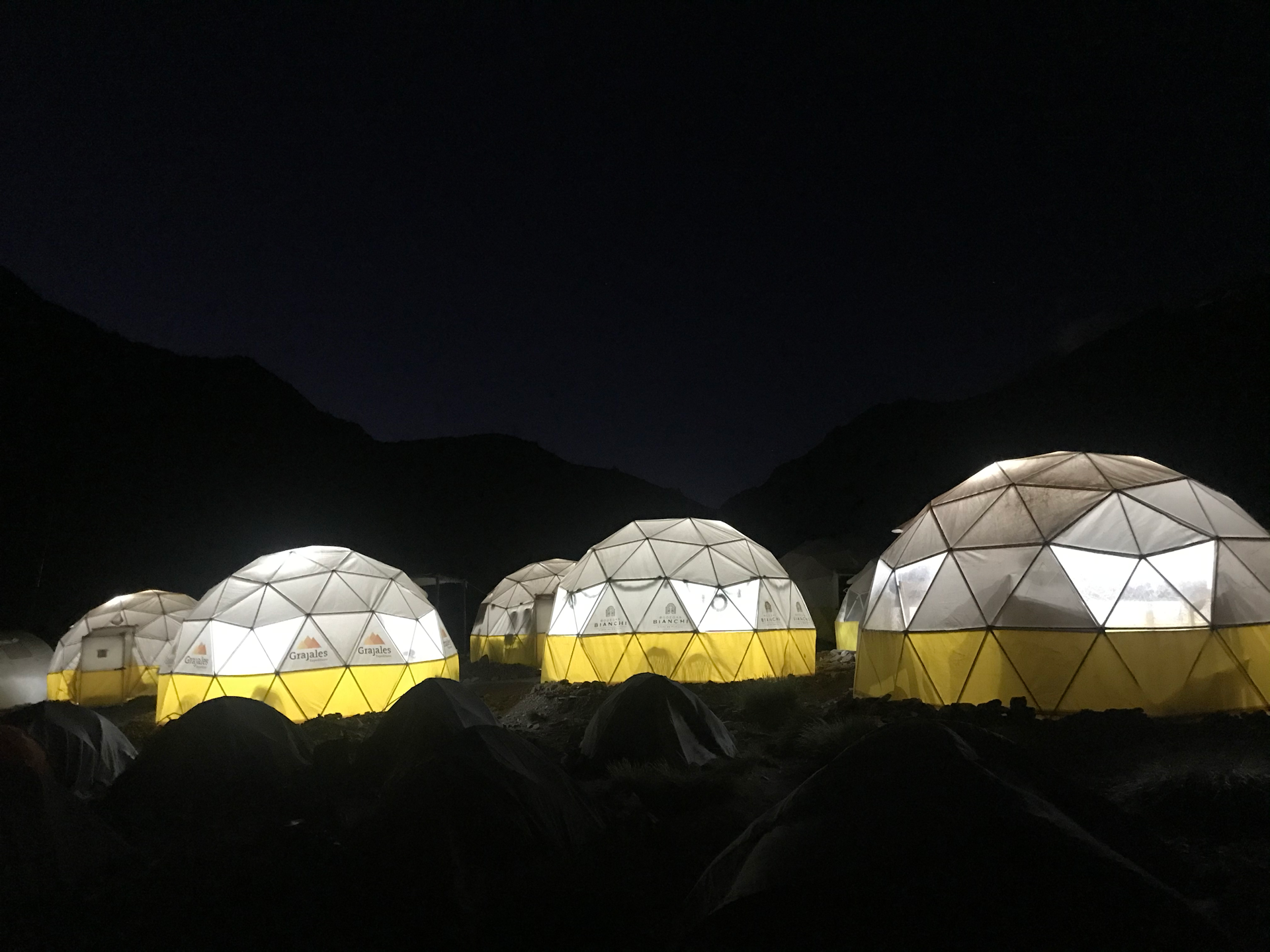 I base camp (4350 moh) samles fjellvandrere og ekspedisjoner fra hele verden. Vår base er tilknyttet en fast camp med spisetelt og kokker som lager varm mat. Tidligere brukte vi en fjellhytte her, men denne er nå stengt.